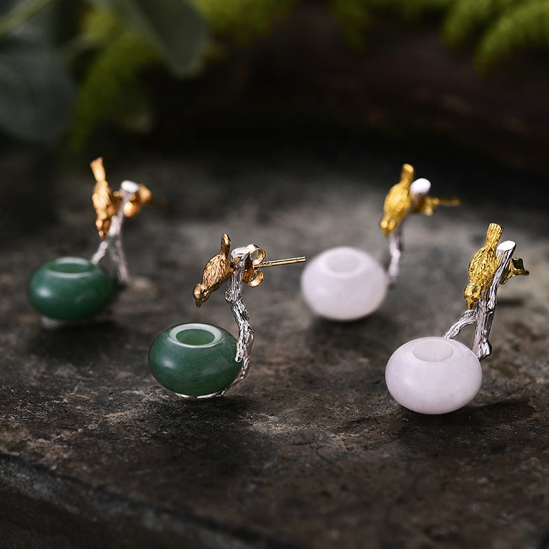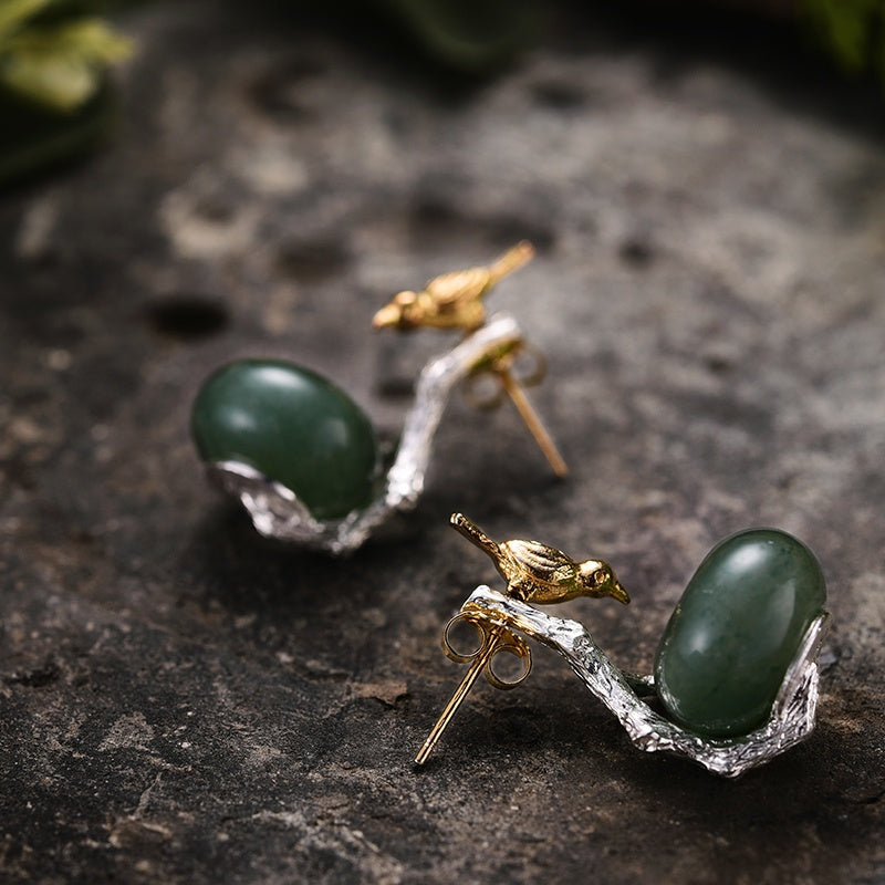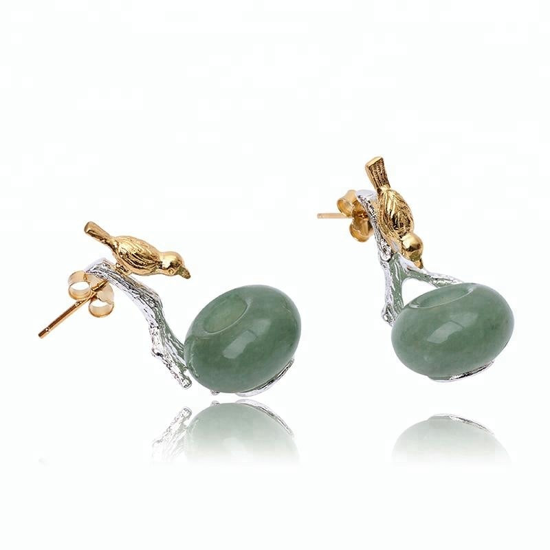 Boucles d'oreilles en argent 925, en forme d'oiseau se désaltérant, assortie d'aventurine.
